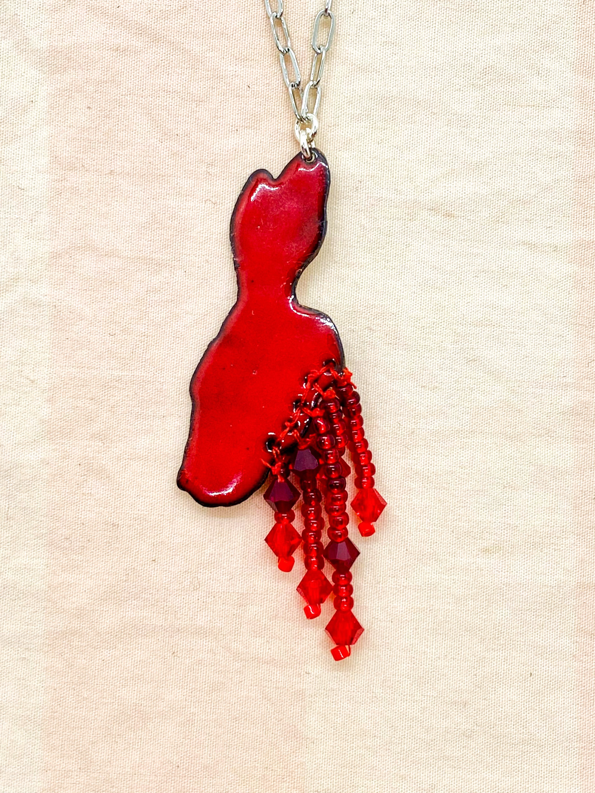 This pendant is inspired by the little animals surrounding my rural home that have gotten caught by cats or foxes, only to have their body parts hoarded like treasure and left at the doorstep or strewn around the yard. The enamel rabbit head has a mixture of red beads spilling out, adding movement and beauty while also depicting blood. A few freshwater pearls accent the read beads, mimicking maggots starting to burrow out. The pendant hangs from plated iron paperclip chain that's finished off with a sterling silver lobster clasp.