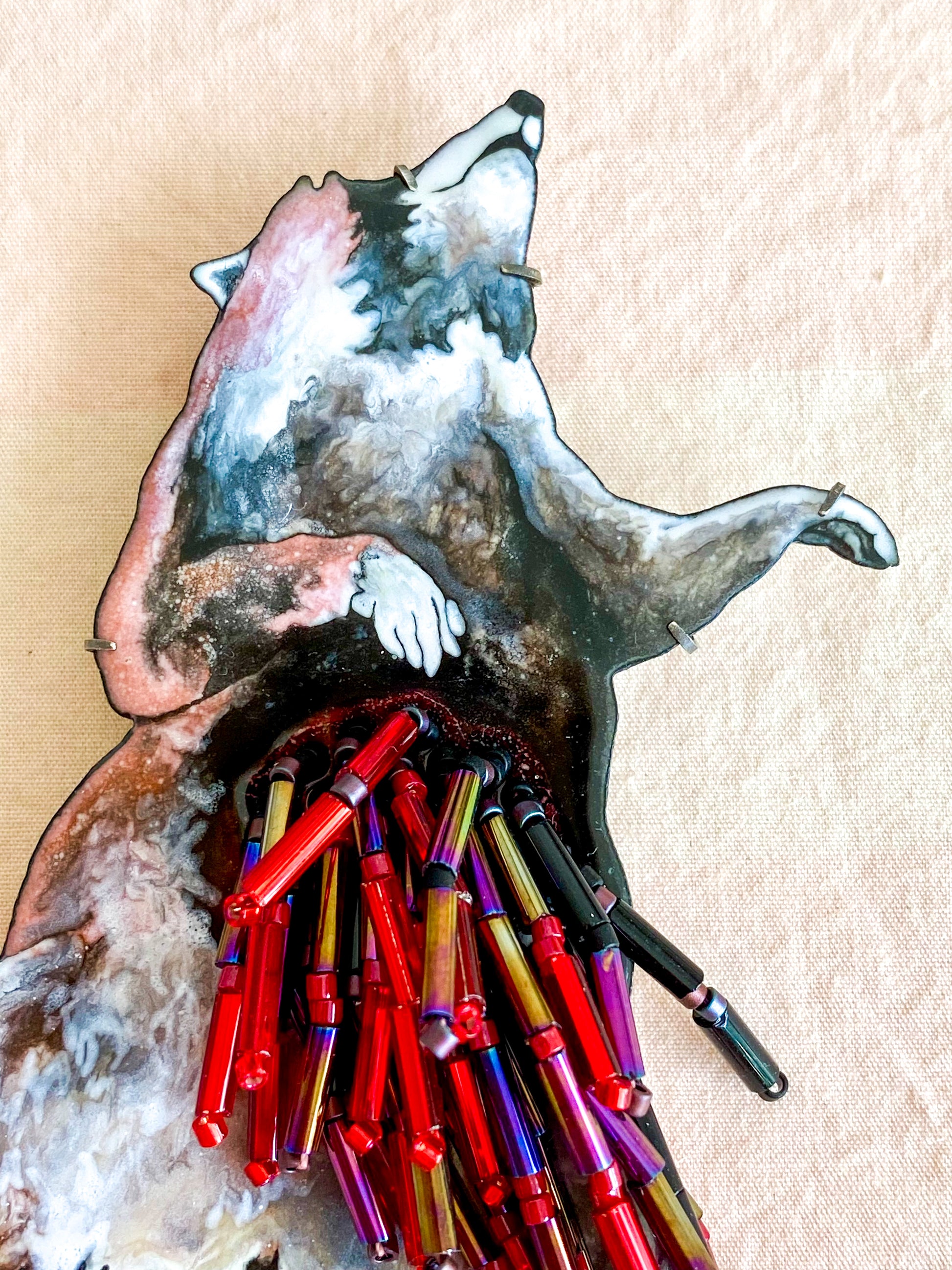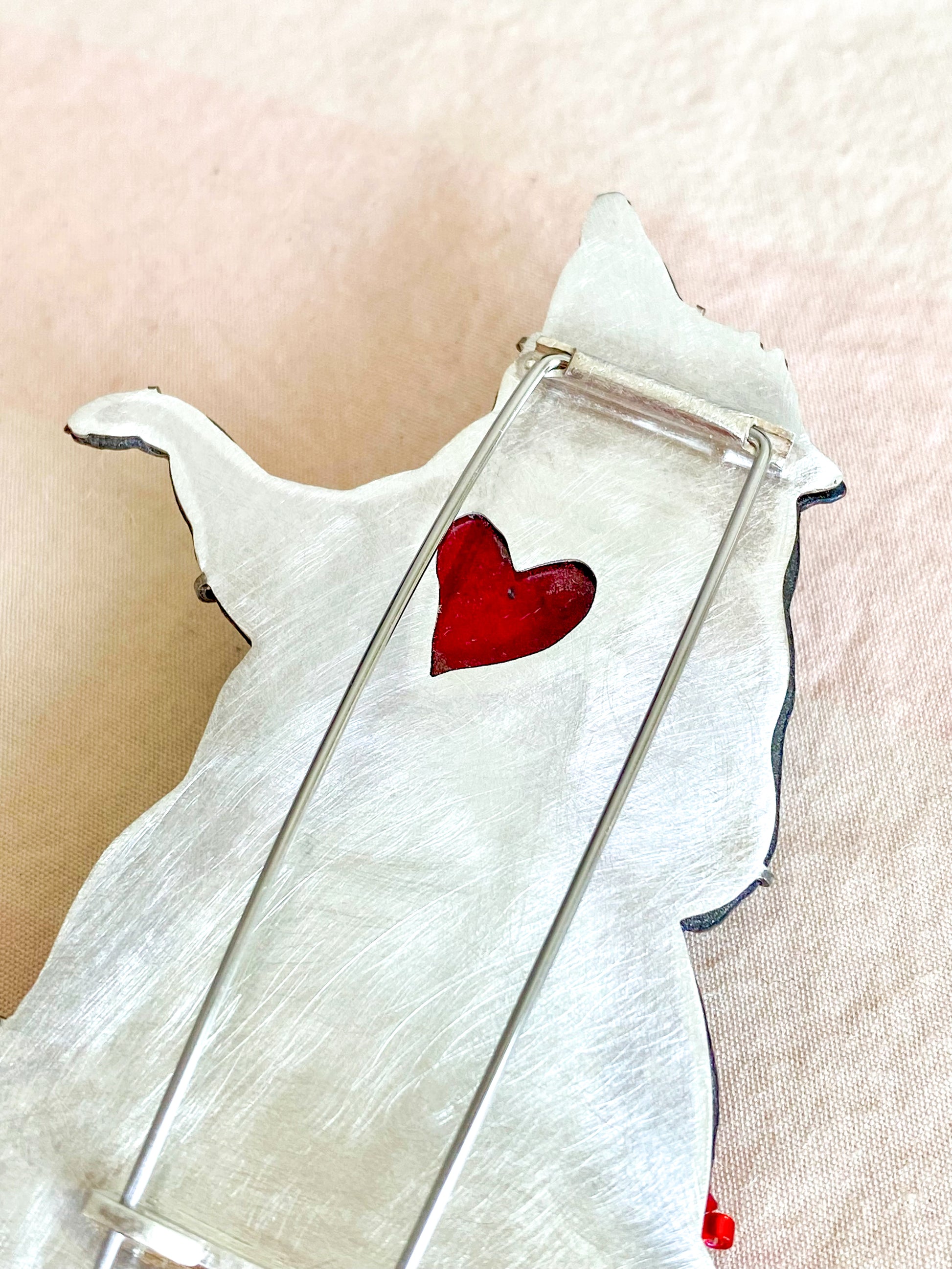 The sterling silver backing has a heart pierced out to honor the raccoon himself and bring to mind the care his deceased body deserved, as well as to let a small pop of red peek through on the back to correspond with the front's beading.