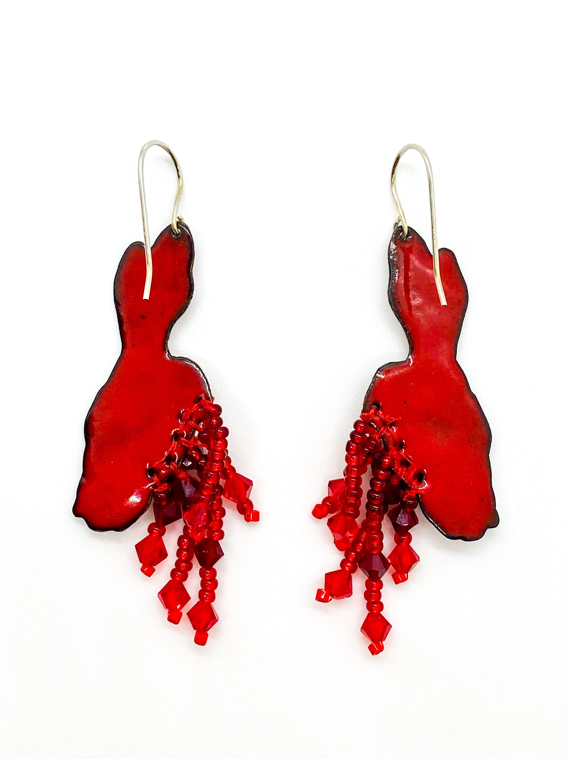 These earrings are inspired by the little animals surrounding my rural home that have gotten caught by cats or foxes, only to have their body parts hoarded like treasure and left at the doorstep or strewn around the yard. The enamel rabbit heads have a mixture of red beads spilling out, adding movement and beauty while also depicting blood. A few freshwater pearls accent the read beads, mimicking maggots starting to burrow out.