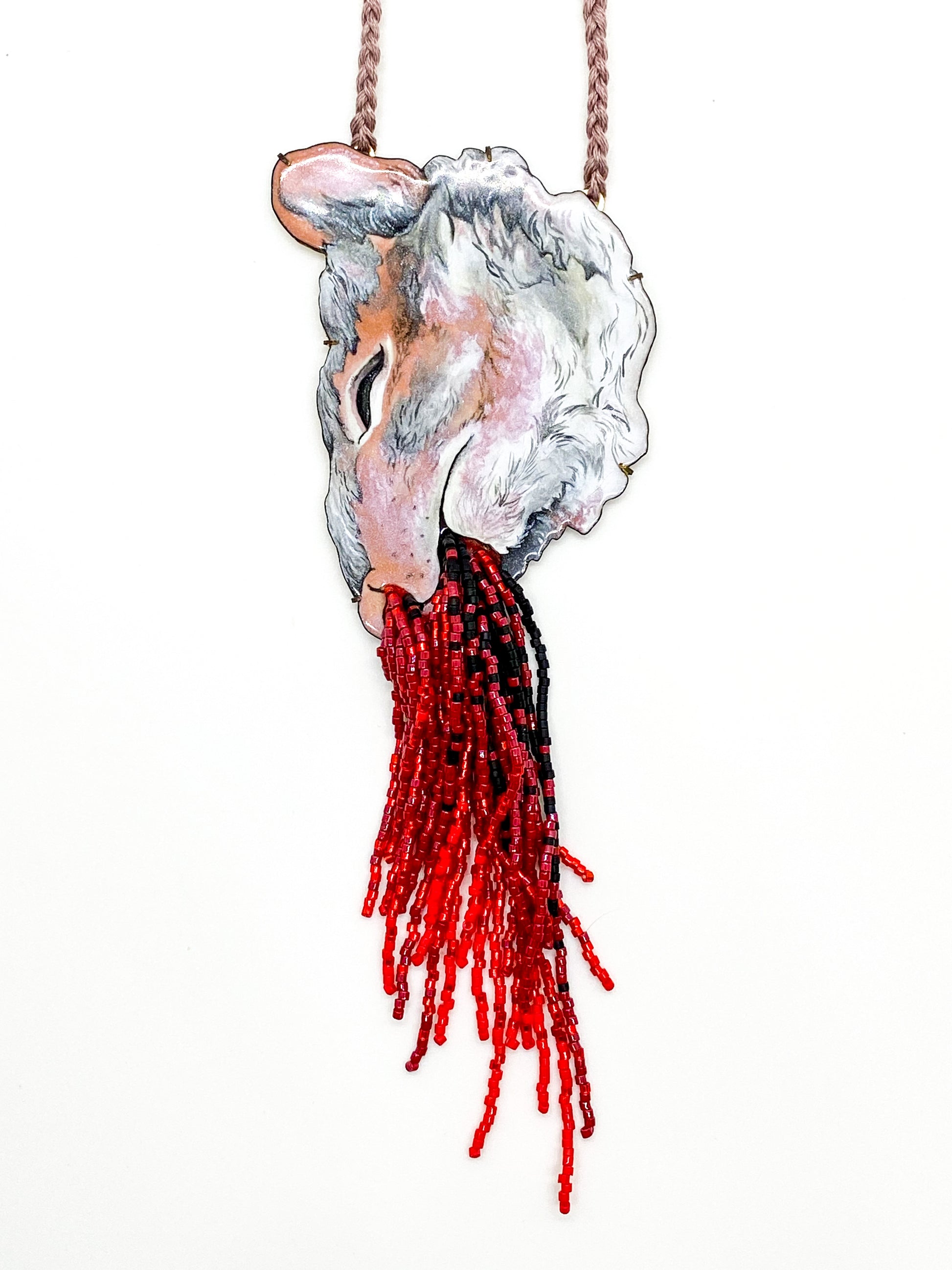 The enameled head features a gradient of red and black beads spilling out from the nose and mouth, adding movement and beauty while also depicting blood. It's set on a brass backing that has a heart cut out for a colorful surprise on the pendant's back, as well as to serve as a reminder of the innocent life lost due to human carelessness. The pendant is suspended from hand-braided embroidery floss finished off with a tasseled knot mimicking the tassel-like appearance of the beaded "blood".