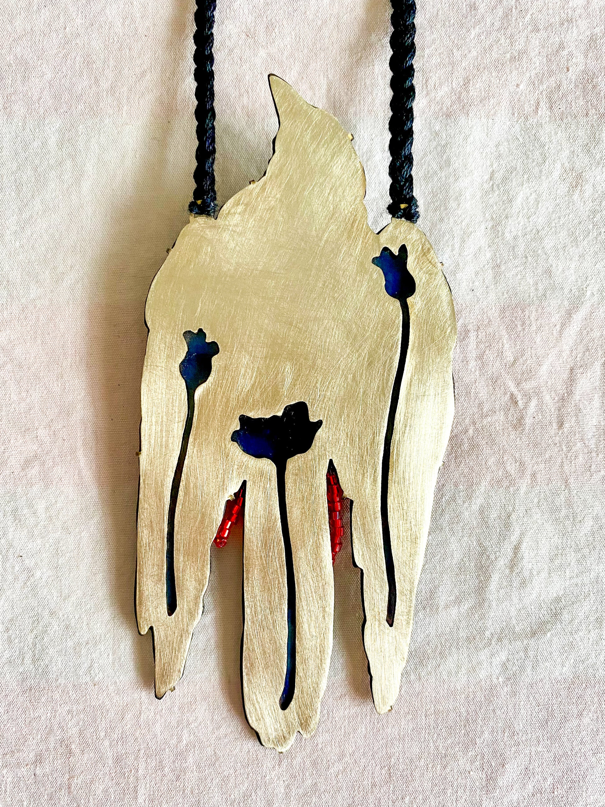 This necklace is in honor of the dead ravens and crows I have happened upon, their majestic shimmery black feathers sometimes acting as a backdrop to the new vibrant red coating them, each of the two colors enhancing one another all the more. The glass beads coming out of the raven's chest add shimmer and shine and draw the eye in and encourage it to further examine the delicate enameled feathers depicting the black and blue hues found within these beautiful birds.