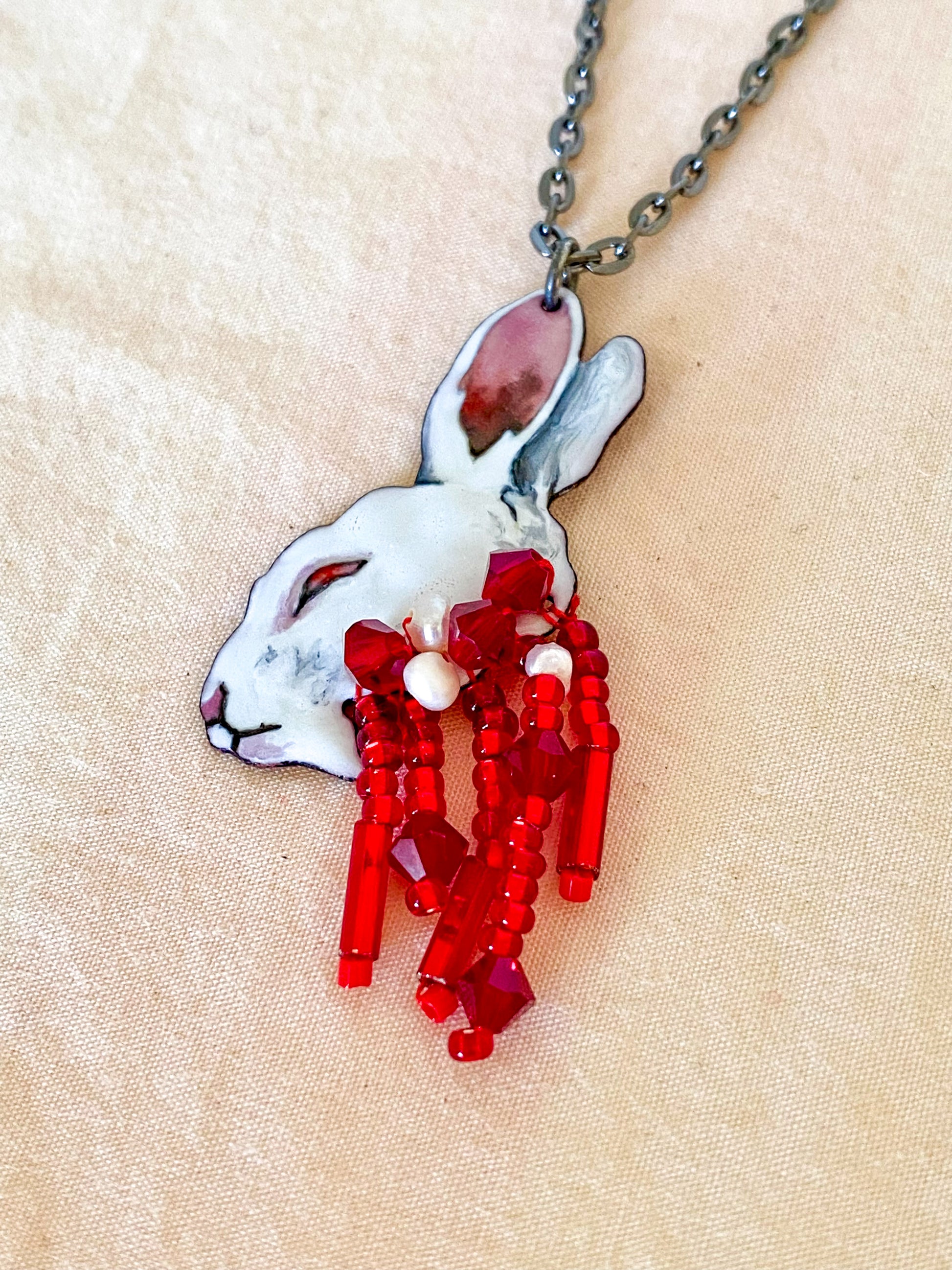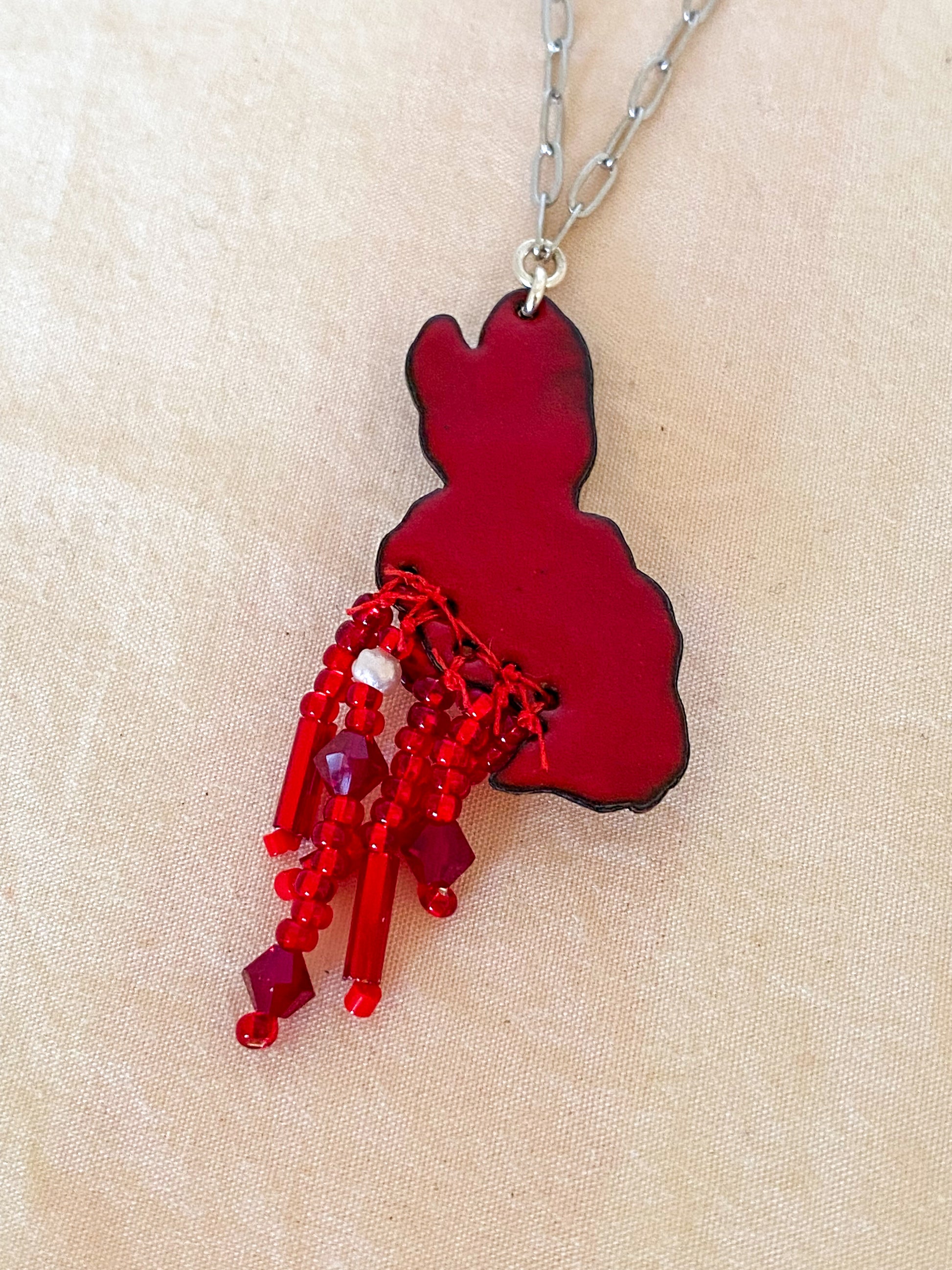 This pendant is inspired by the bodies of animals I find mangled in the road, often at the edge where it meet the forests surrounding my rural home. The enamel head has a mixture of red beads spilling out from it, adding movement and beauty while also depicting blood embellished with tiny pearl "maggots". The pendant hangs from delicate sterling silver chain finished off with a sterling silver lobster clasp.