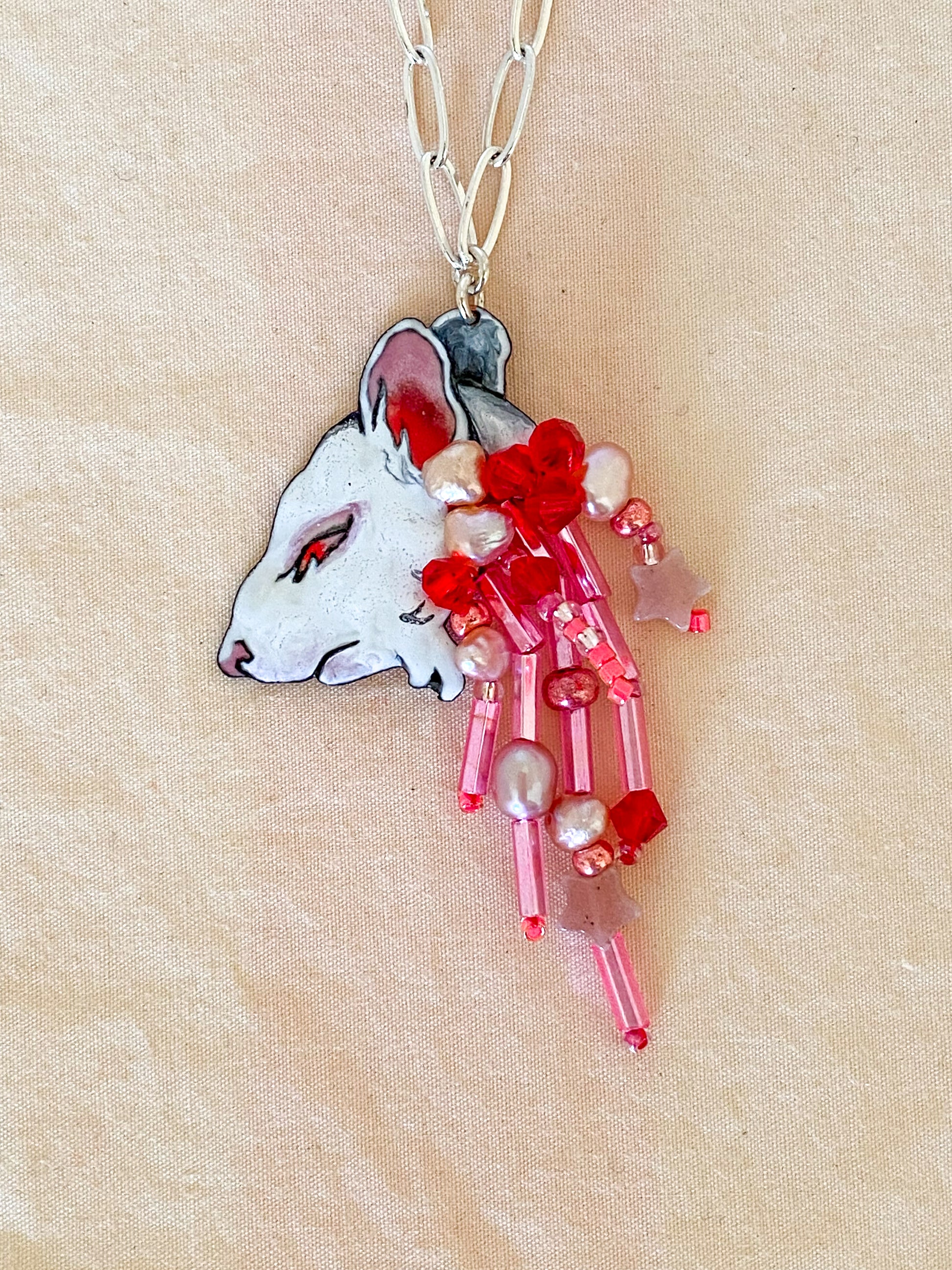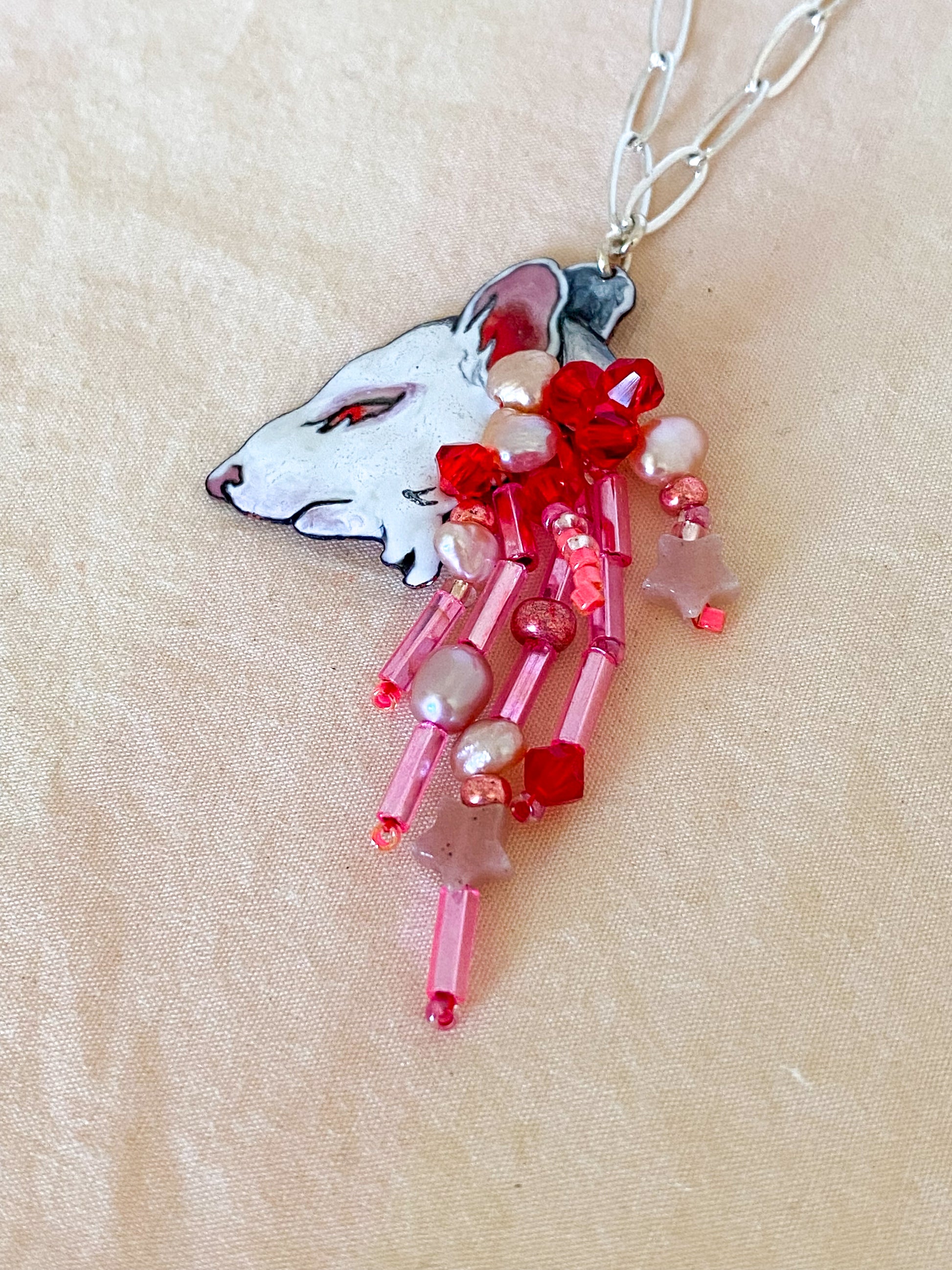 This mouse necklace is inspired by the neighborhood cats I see passing through my back yard with birds or mice hanging from their mouths. The pendant features a mixture of pearls, stones, and beads, all in an ombre of fleshy pinks and red, spilling out from the enameled mouse head, adding movement and beauty while also depicting the innards trailing behind.