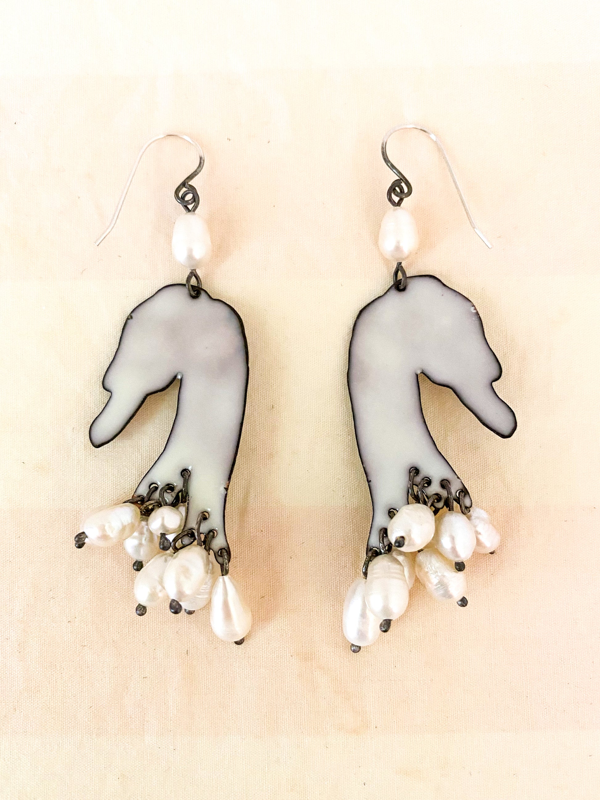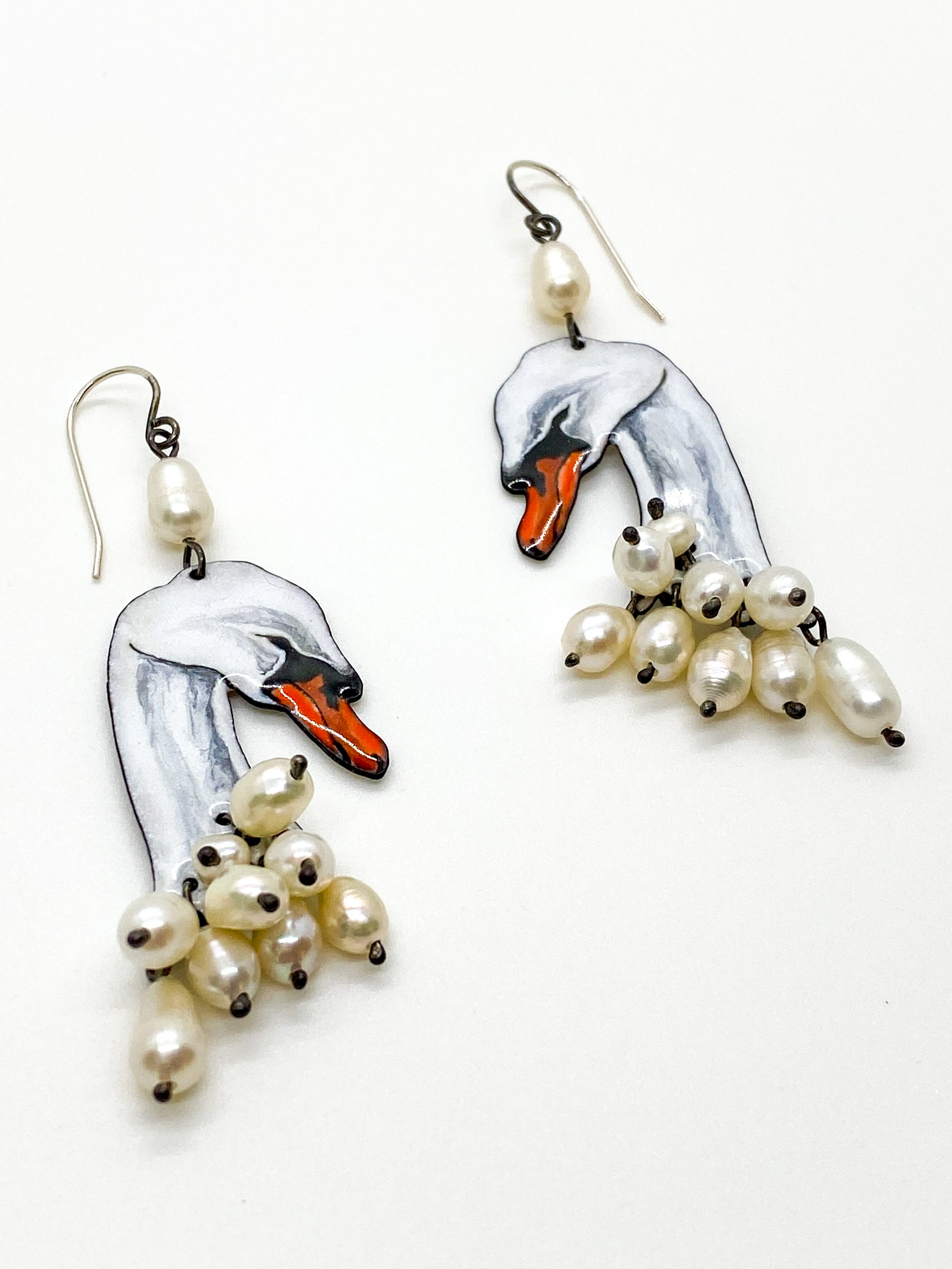 This pair of earrings is inspired by the the swans who frequented a canal I lived up the block from in Brooklyn, NY. There were large groups of them floating in the water most days, and they looked especially elegant at night, transforming into glowing orbs floating atop the black water. These earrings feature an array of freshwater pearls hanging below the enamel swans' necks, and one atop each of their heads.